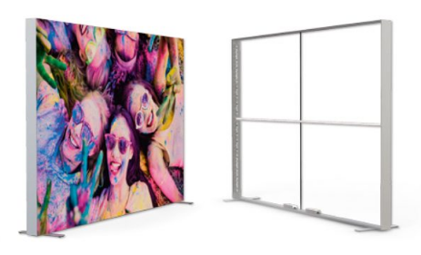 Der MULTIframe SIDELIGHT von Druckamt in Berlin ist ein vollflächig hinterleuchteter LED Rahmen mit einer Bautiefe von nur 12-16 cm (bis 200 cm Höhe: 12cm, ab 250cm Höhe: 16cm Bautiefe). Das einseitig und doppelseitig verwendbare Aluminiumrahmenprofil eignet sich dank der stabilen Füße hervorragend für den Einsatz als Raumteiler. Durch die spezielle Linsenform der LED Module kann man trotz der schmalen Bautiefe keinerlei Lichtpunktbildung auf der Stoffoberfläche entdecken – das Motiv wird einheitlich und schattenfrei dargestellt. Die Stoffgrafiken sind mit Gummilippen versehen, die ihnen einen perfekten Halt im Rahmensystem ohne Falten geben. Darüber hinaus ist mit diesem System ein einfacher und rascher Grafikwechsel möglich. Nicht nur die Leuchtkraft von ca. 5000 lm, sondern auch die homogene Ausleuchtung machen den MULTIframe SIDELIGHT zu einem Leuchtrahmen, der alle ähnlichen Produkte in den Schatten stellt. Alle Systemteile sind auch als Einzelteile erhältlich.