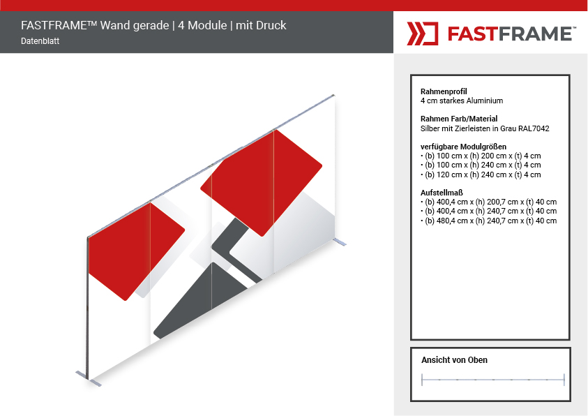Der FASTFRAME™ gerade Wand mit 4 Modulen ist die ideale Lösung für professionelle Präsentationen, Messen und Events. Dank seines leichten, vormontierten Aluminiumrahmens mit 40 mm Profil lässt er sich in Sekundenschnelle aufstellen – ganz ohne Werkzeug. Eine zentrale Stützstange sorgt für zusätzliche Stabilität, während optionale Standfüße den Halt optimieren.