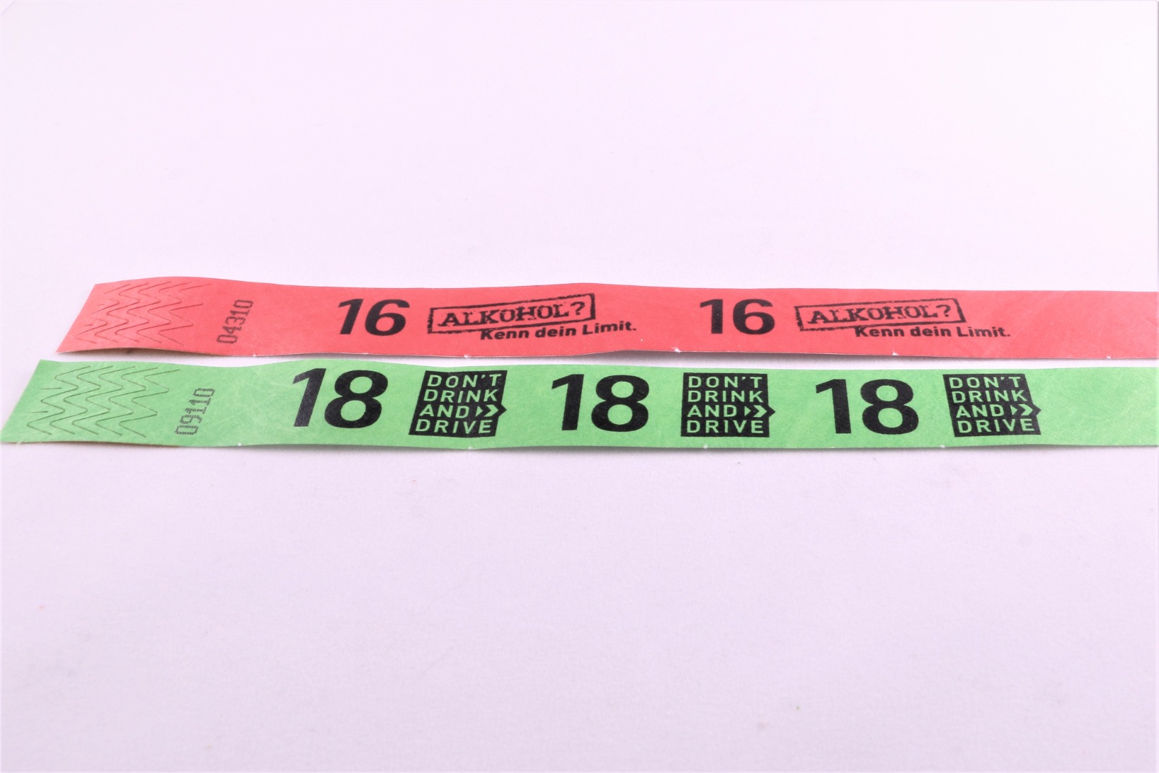Einlassbänder aus reißfestem Tyvek - für gewerbliche wie private Zwecke von Druckamt aus Berlin - 100% nicht übertragbar dank festem Klebestreifen mit Perforation.